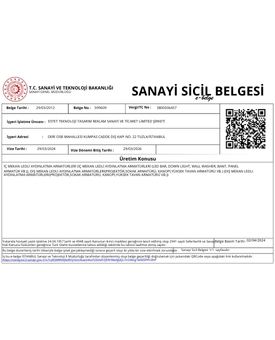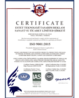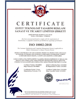 BELGELERİMİZ ISO 9001 SERTİFİKA ISO 14001 SERTİFİKASI ISO 45001 SERTİFİKA ISO 10002 SERTİFİKA YERLİ MALI BELGESİ KAPASİTE RAPORU ANGOLO PROJEKTÖR CE BELGESİ PALİ SOKAK ARMATÜRÜ CE BELGESİ CE MUAFİYET BELGESİ ÇALIŞMA RUHSATI HİZMET YETERLİLİK BELGESİ SANAYİ SİCİL BELGESİ