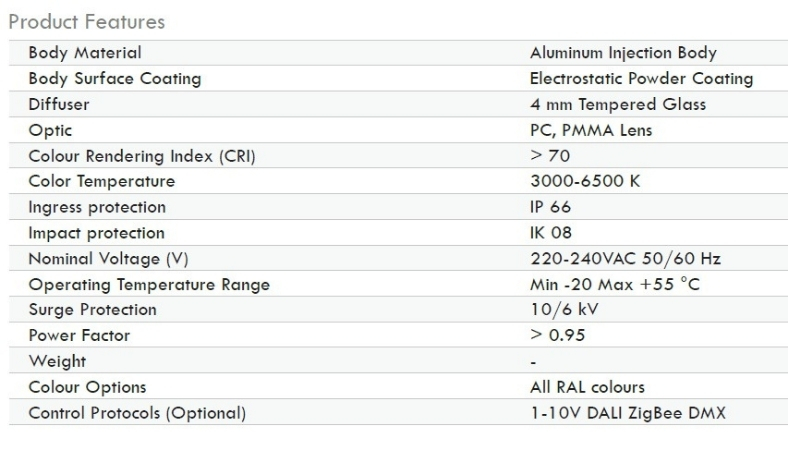 | Ürün Grubu | Ürün Adı | Ürün Kod | Güç | Işık Akışı | Işık Renk | Ölçüler | Sınıfı |